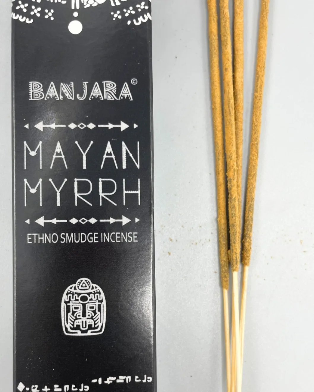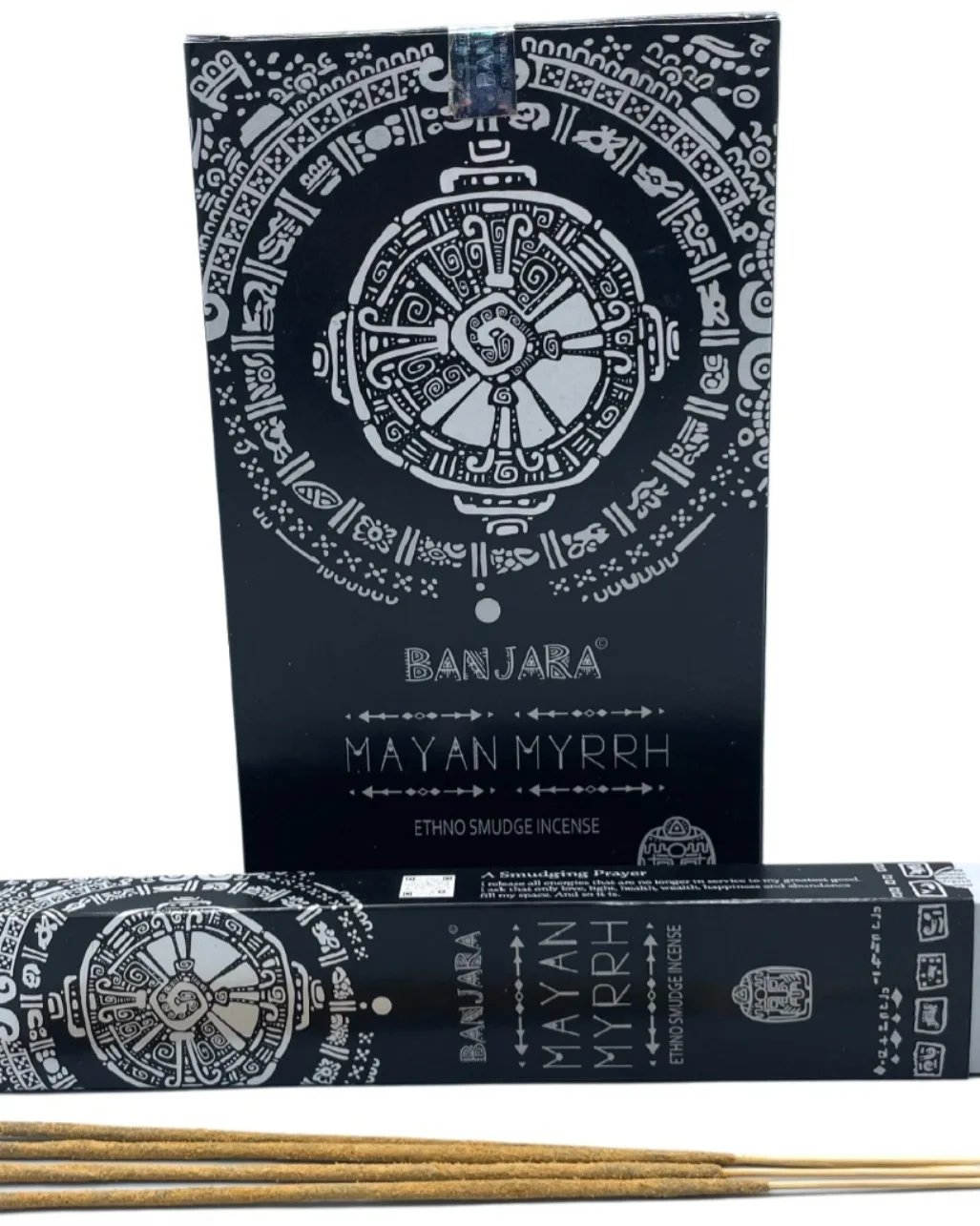 Племенските стапчиња темјан на Банџара – волшебно и ароматично патување кое им оддава почит на древните традиции и ритуали. Секоја кутија е порта кон светот на природни мириси, нудејќи длабоко сетилно искуство, украсена со сложени дела инспирирани од Маите претворајќи ја во минијатурно уметничко дело. Во неа се наоѓа упатство како да се исчисти и активира моќта на процесот на подкадување (smudging) и една моќна молитва.Мирото покрај неговиот пријатен, топол и земјен мирис, може да помогне да се убијат штетните бактерии, олеснување на стресот, а во некои магични практики, мирото е вклучено во работата за прекинување проклетства и клетви или за заштита од магичен и психички напад.