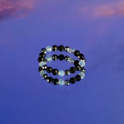 Месечевиот камен додава мек, прозрачен сјај, обсидијанот внесува длабочина и контраст, а аметистот воведува нежен бран на бои. Секој прстен има свое присуство, додека носени заедно тие формираат избалансиран, небесен изглед.
