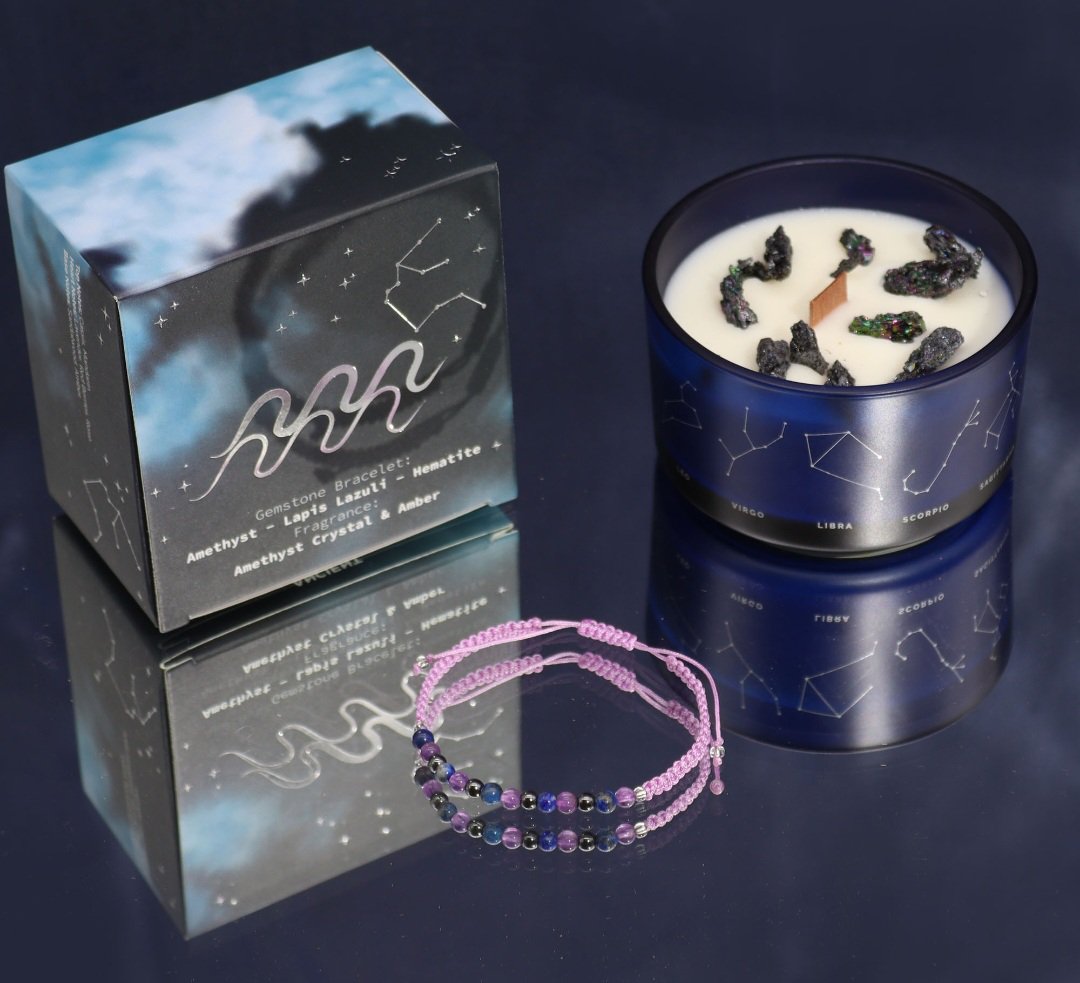 Оваа уникатна комбинација на свеќа и нараквица е совршена за родендени, ритуали за грижа за себе или како внимателен подарок инспириран од зодијакот.