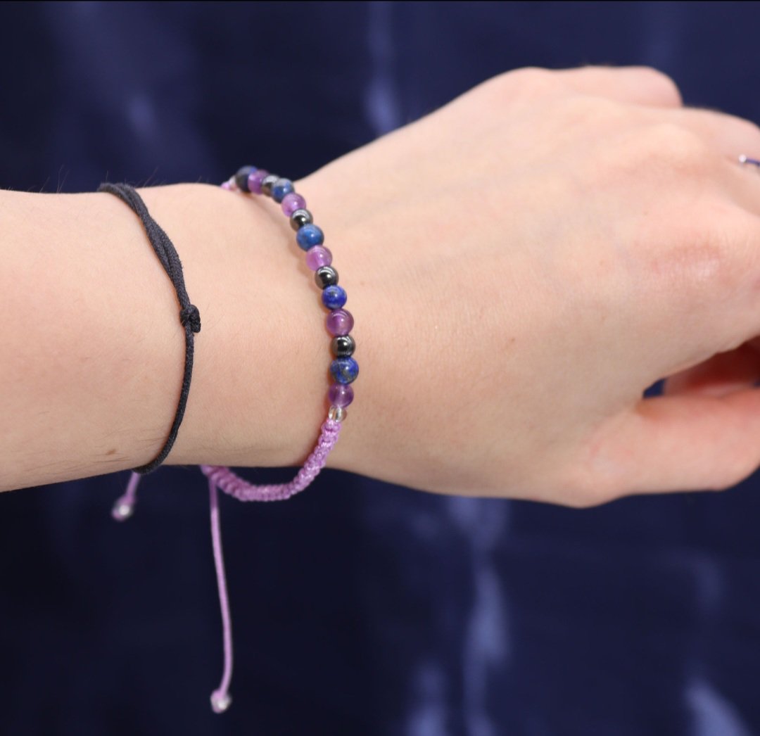 Комплетот вклучува нараквица од скапоцен камен од аметист, лапис лазули и хематит. Секој камен е внимателно избран за да се усогласи со јаките страни на Водолија: